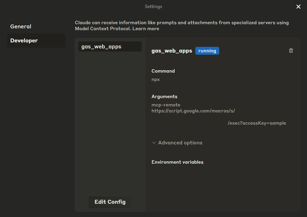 To test this Web App, Claude Desktop is used. Ref In this case, the claude_desktop_config.json is configured as follows. Please replace https://script.google.com/macros/s/###/exec with your Web App URL.