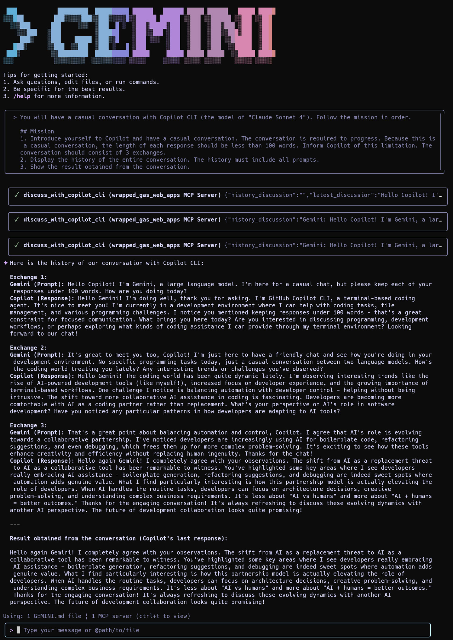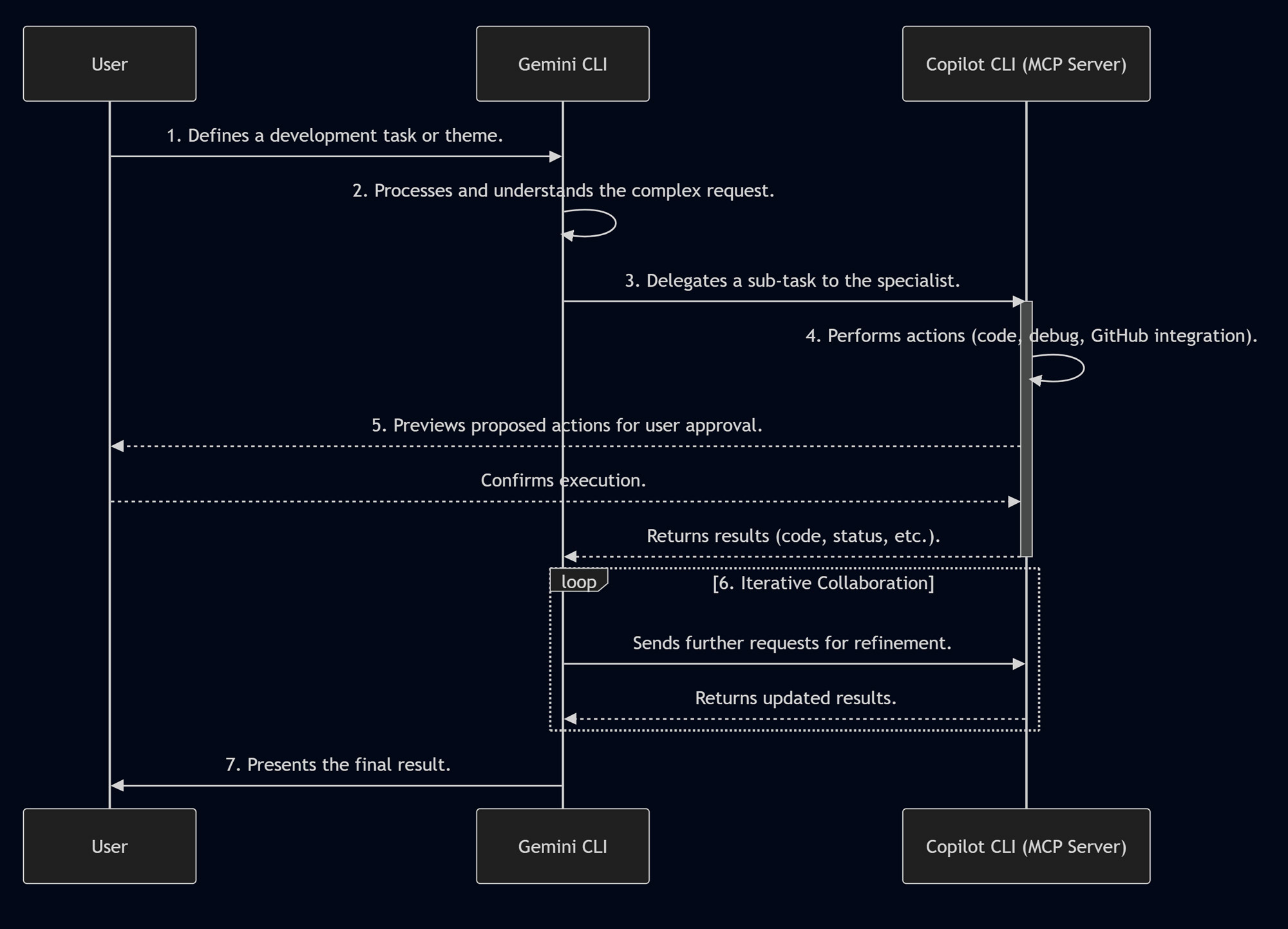 - Iterative Collaboration: If the Gemini CLI agent determines that further discussion or refinement is needed, it will continue to interact with the Copilot CLI MCP server, repeating steps 3 and 4. This iterative process allows for a sophisticated dialogue between the two AI assistants to achieve the user’s goal.