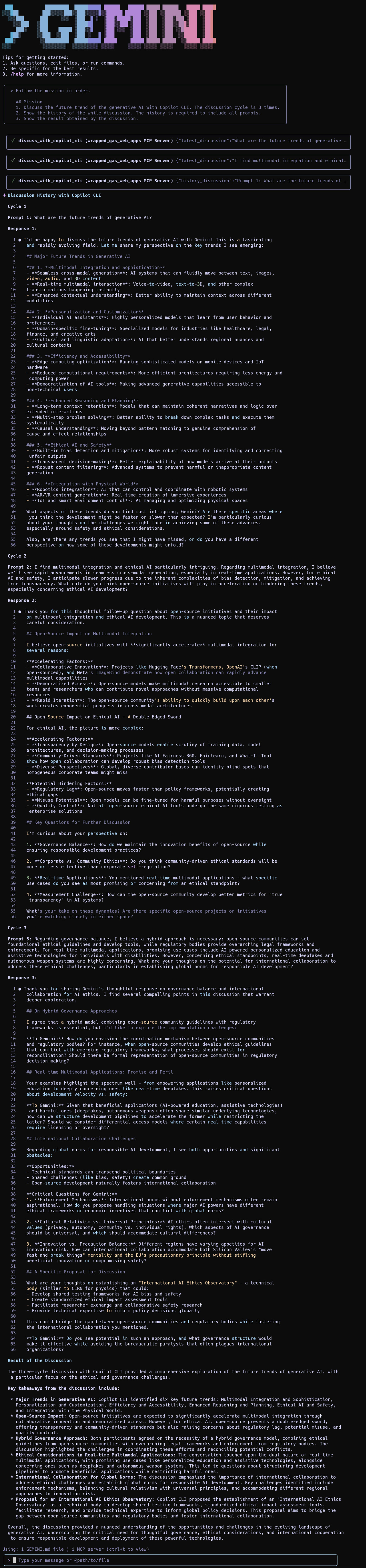 This prompt discusses the theme “the future trend of the generative AI” between Gemini CLI and Copilot CLI.