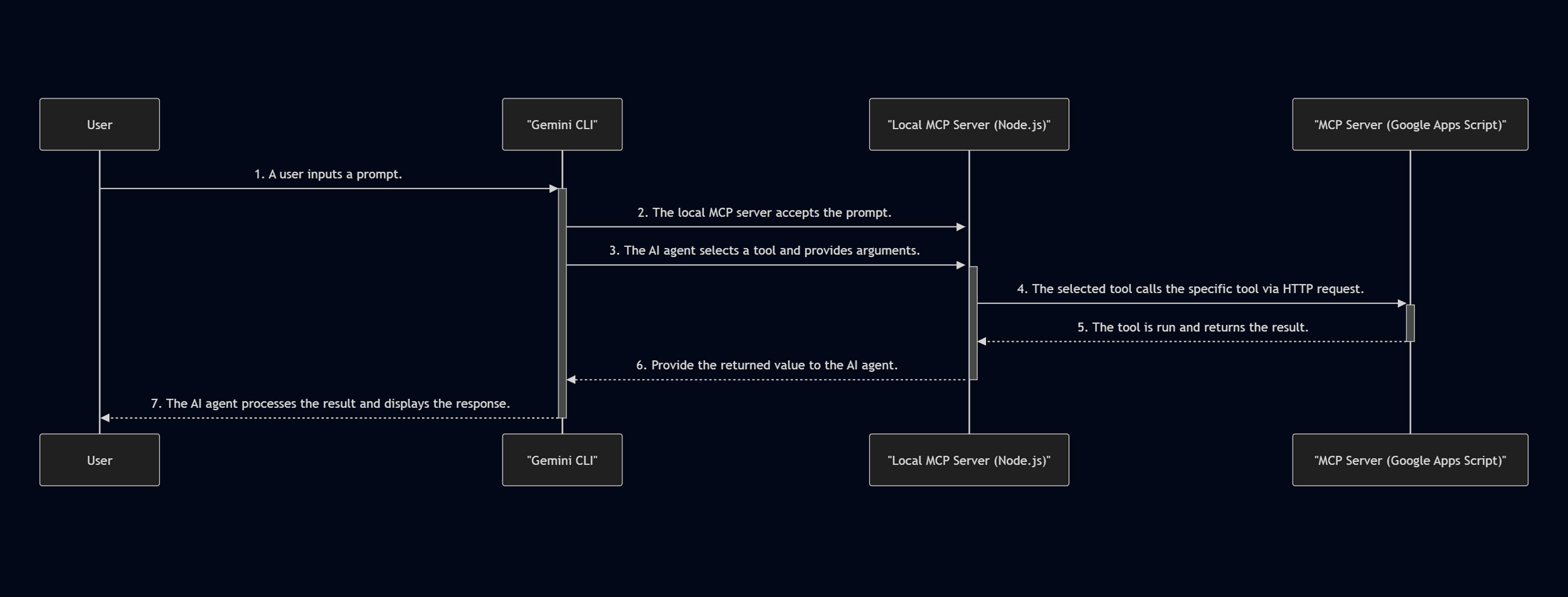 - The local server calls the corresponding tool on the GAS MCP server via an HTTP request.