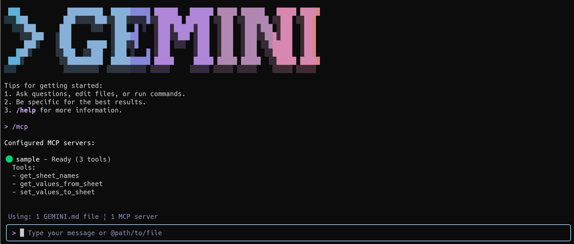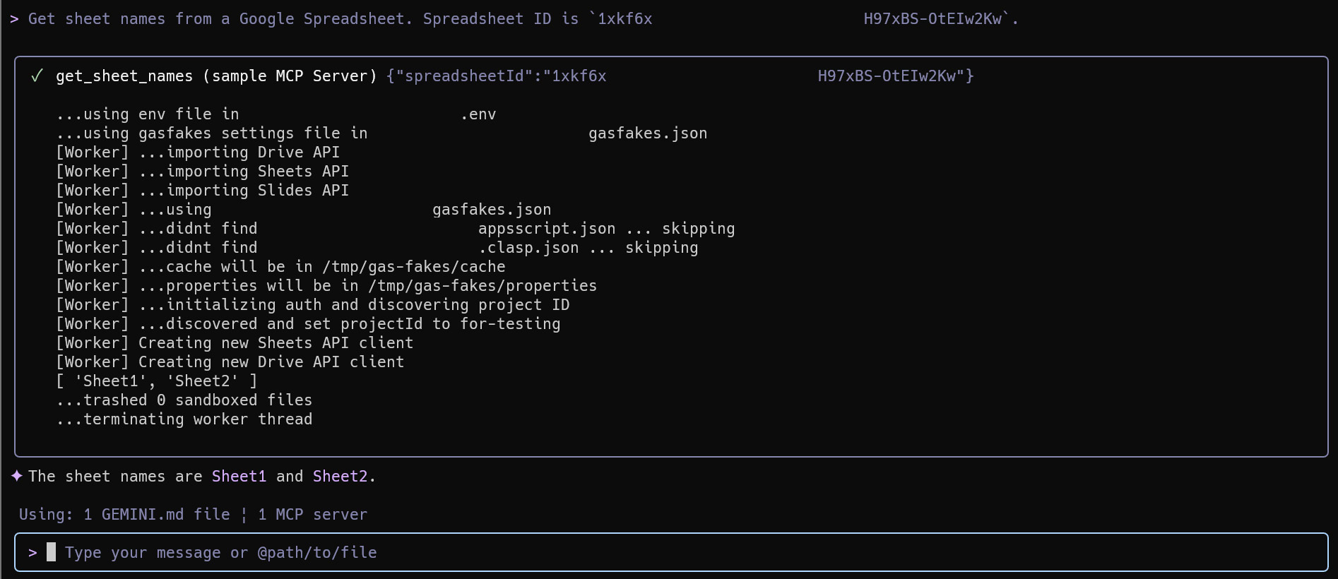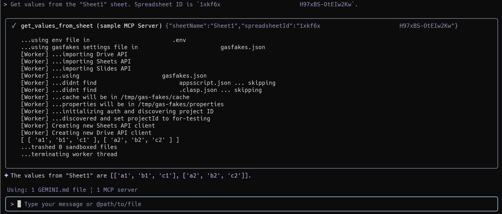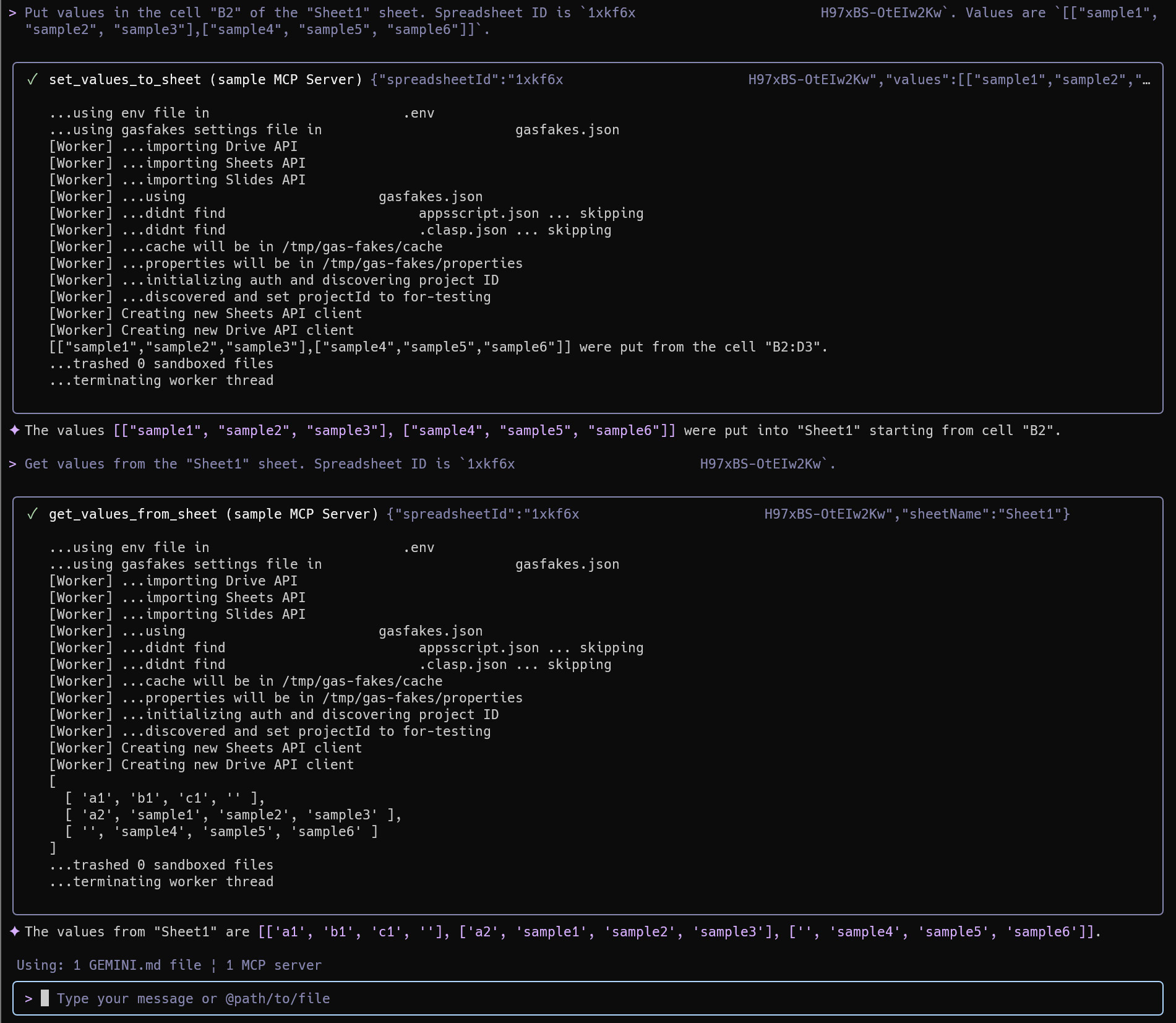 gas-fakeswith theGemini CLI—a tool for interacting with Google’s Gemini generative AI model—I demonstrated a method for dynamically creating and deleting tools for a local Model Context Protocol (MCP) server using Google Apps Script. Ref - An Enhanced Developer Experience with a CLI and Extension: We developed a CLI tool and an MCP server for simply using