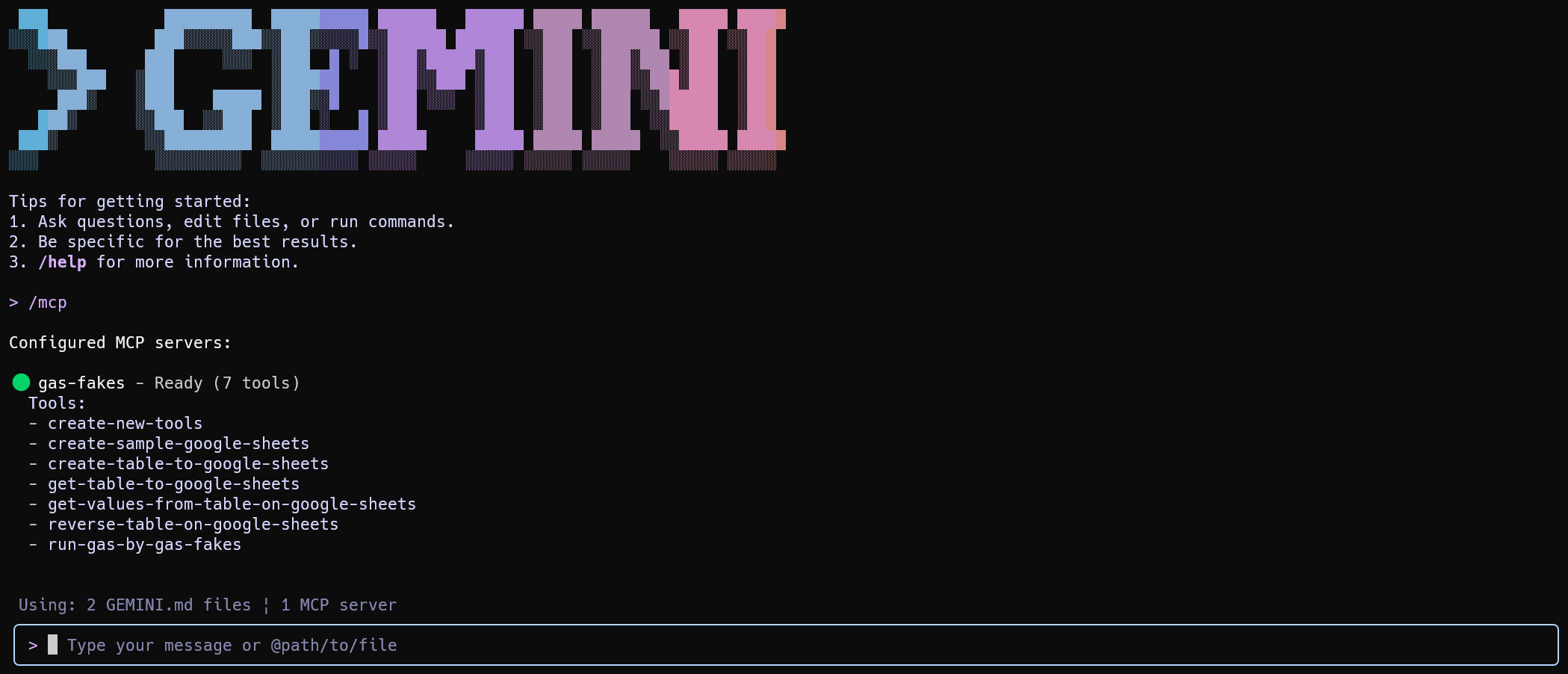 After launching the Gemini CLI, run the command /mcp to verify that the custom tools are successfully loaded.