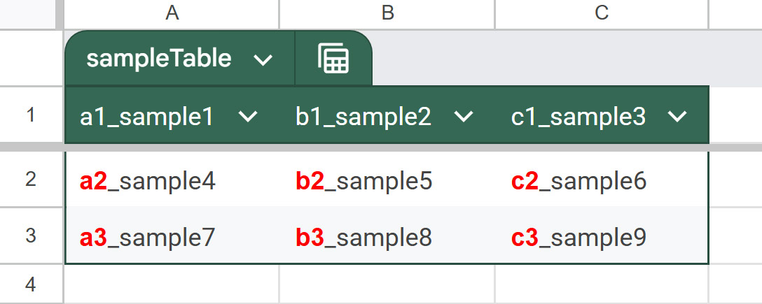 The values [["a1_sample1","b1_sample2","c1_sample3"],["a2_sample4","b2_sample5","c2_sample6"],["a3_sample7","b3_sample8","c3_sample9"]] are returned from the “sampleTable”.
