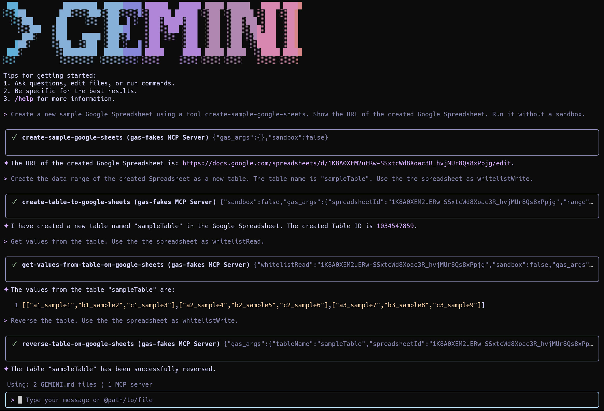 Before building the MCP server, let’s verify that gas-fakes can correctly load and execute a library.