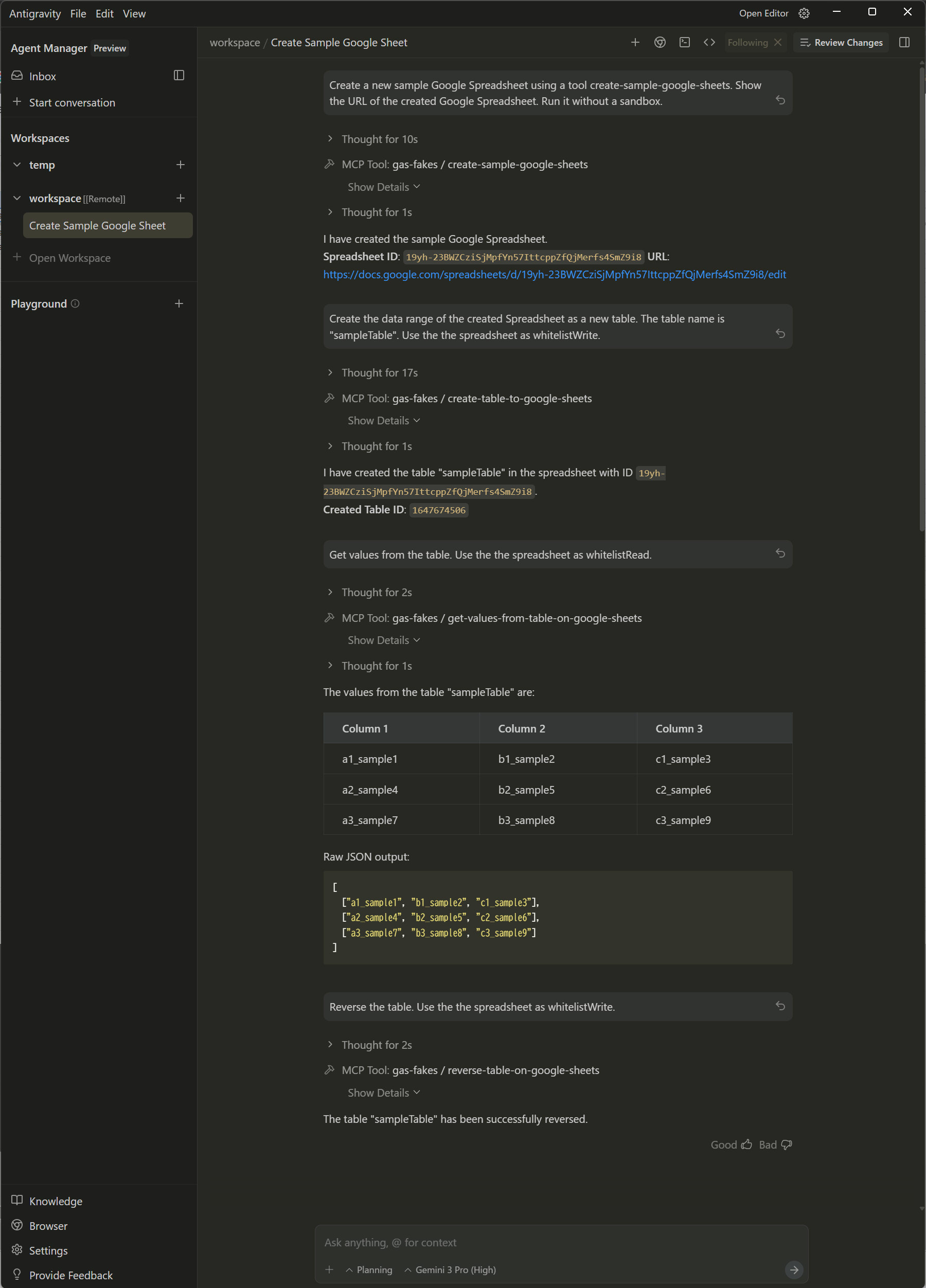 The testing process for Creating a Spreadsheet, Creating a Table, Getting Values, and Reversing a Table yielded identical results to the Gemini CLI tests. This confirms that the MCP server functionality is consistent across different AI agent environments when powered by the updated gas-fakes library support.