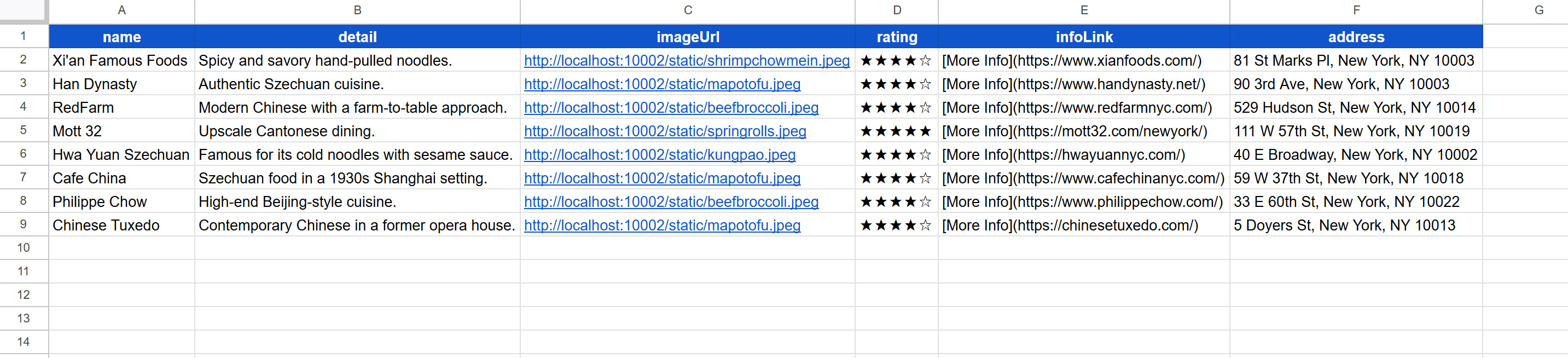 One of the strengths of using Google Apps Script is the ease of integrating Google Workspace data. In this sample, the restaurant data is currently hard-coded in the executeGetRestaurants function. Ref However, you can easily fetch this data from a Google Spreadsheet.