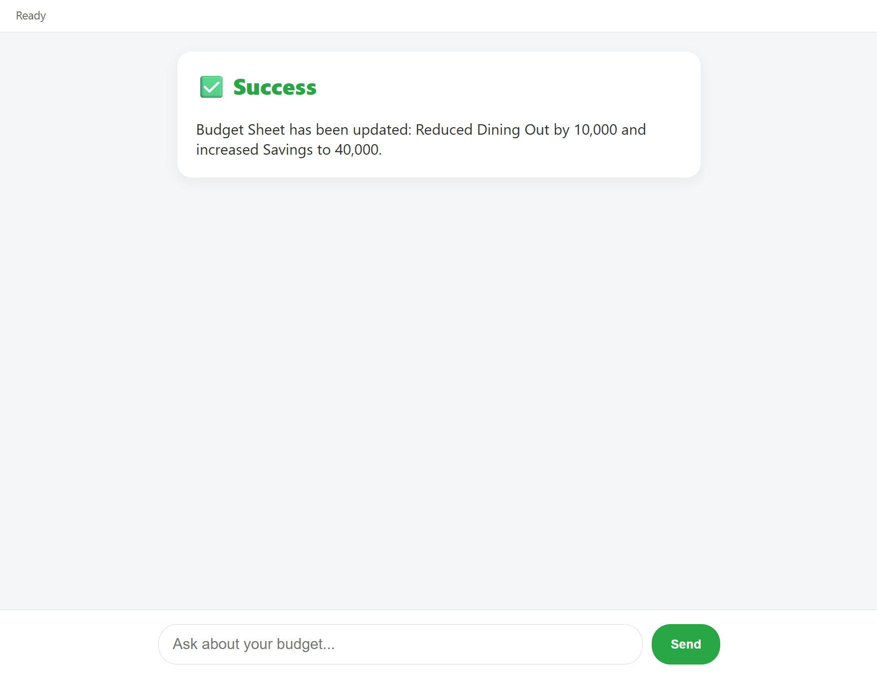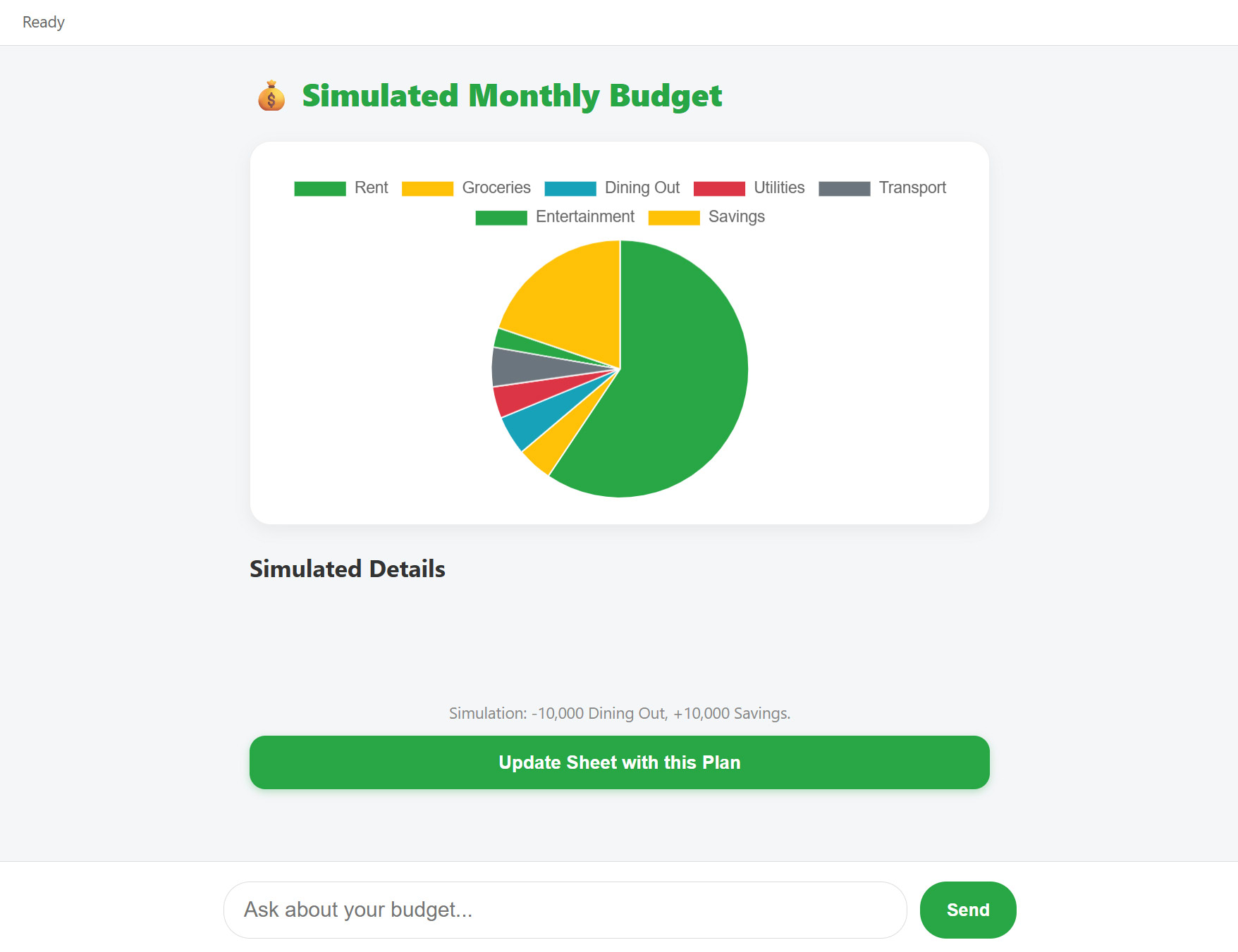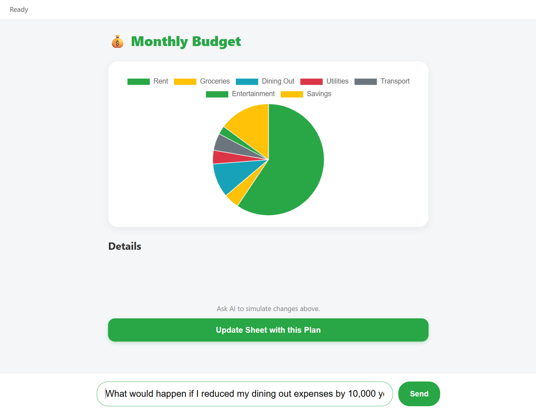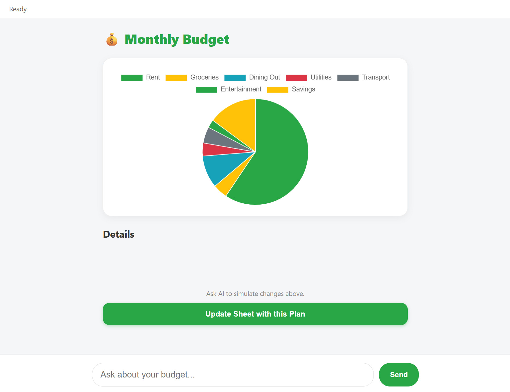 Enter the prompt Check this month's budget. Gemini will read the spending data from the spreadsheet. A2UI will then display a breakdown of expenses in a pie chart and a category list.