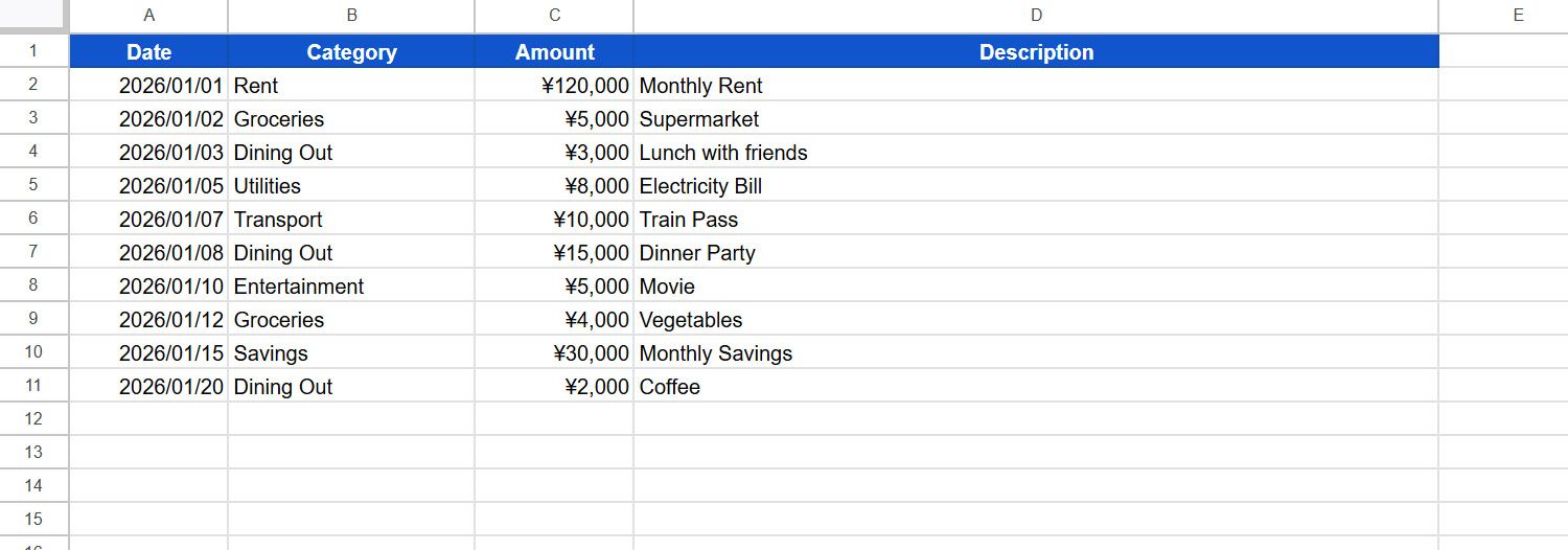 Before running the script, check “Sheet1” in the Google Sheet. You should see the following table: