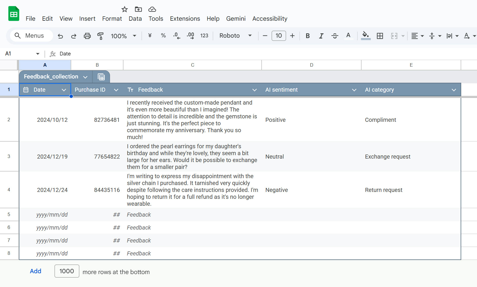 The PDF contains a table for tracking customer feedback, including manual input and AI-generated analysis. The table consists of five columns: **Date**, **Purchase ID**, **Feedback**, **AI sentiment**, and **AI category**.