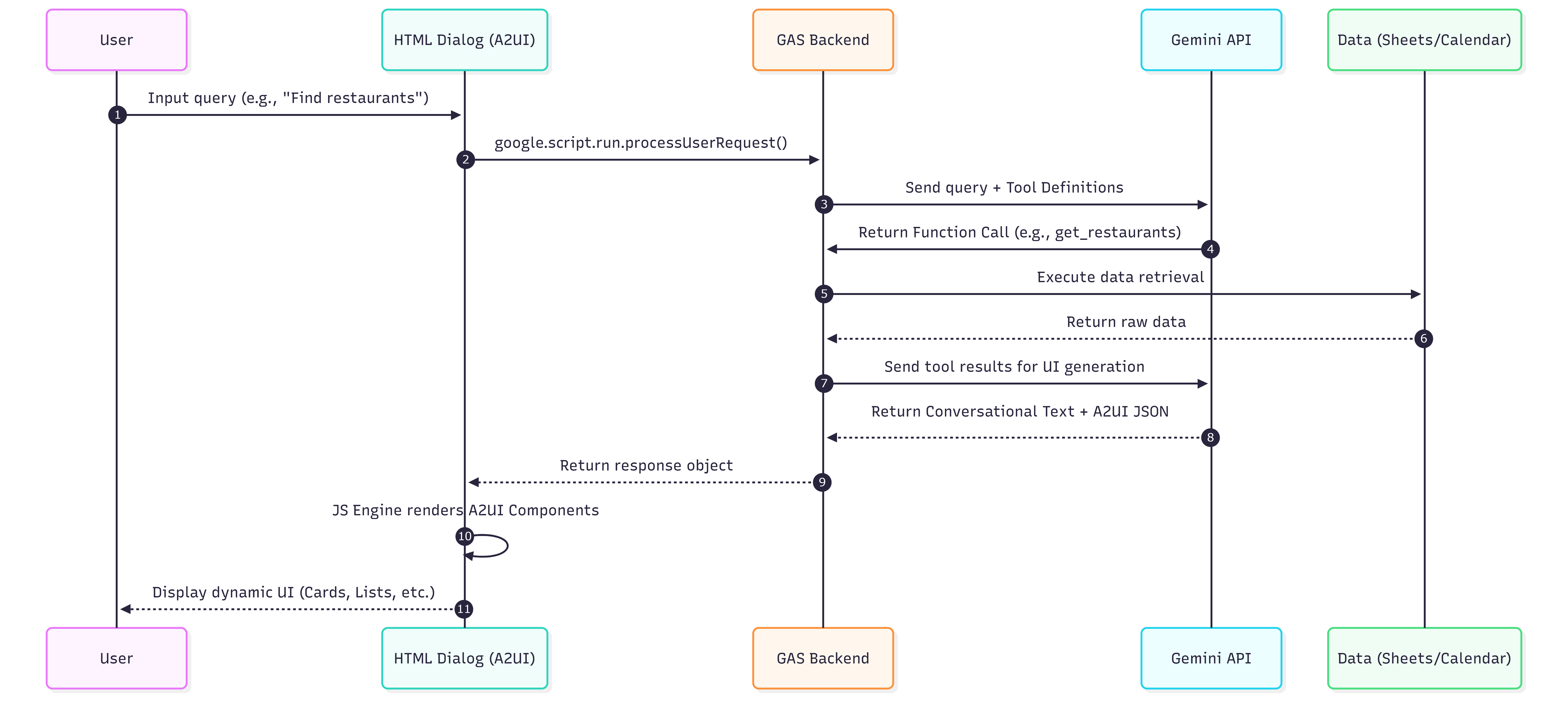- Client-Side Rendering: The GAS backend returns this payload to the HTML dialog. A dedicated JavaScript rendering engine within the dialog parses the A2UI JSON and dynamically builds high-quality UI components like interactive cards, lists with images, and booking forms.